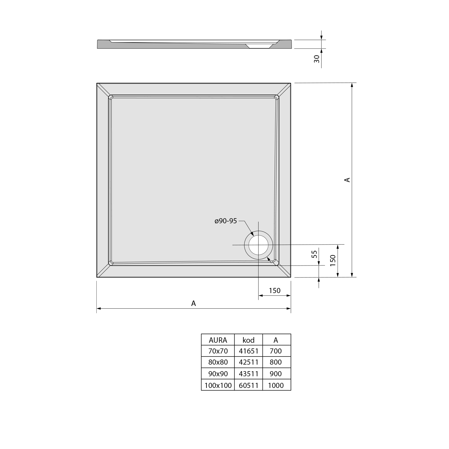 43511 POLYSAN AURA öntöttmárvány zuhanytálca, 90x90x4cm