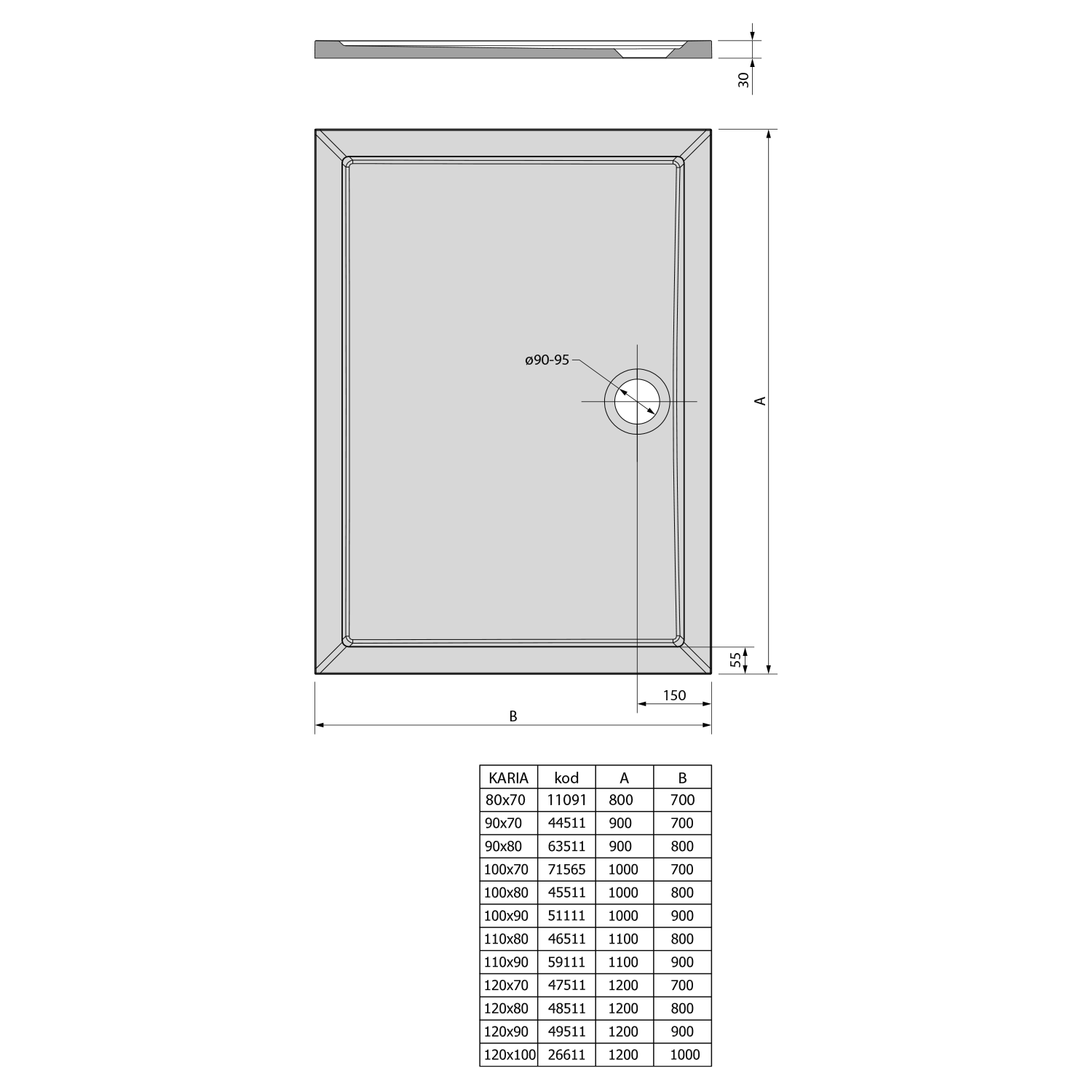 59111 POLYSAN KARIA öntöttmárvány zuhanytálca, 110x90x3cm
