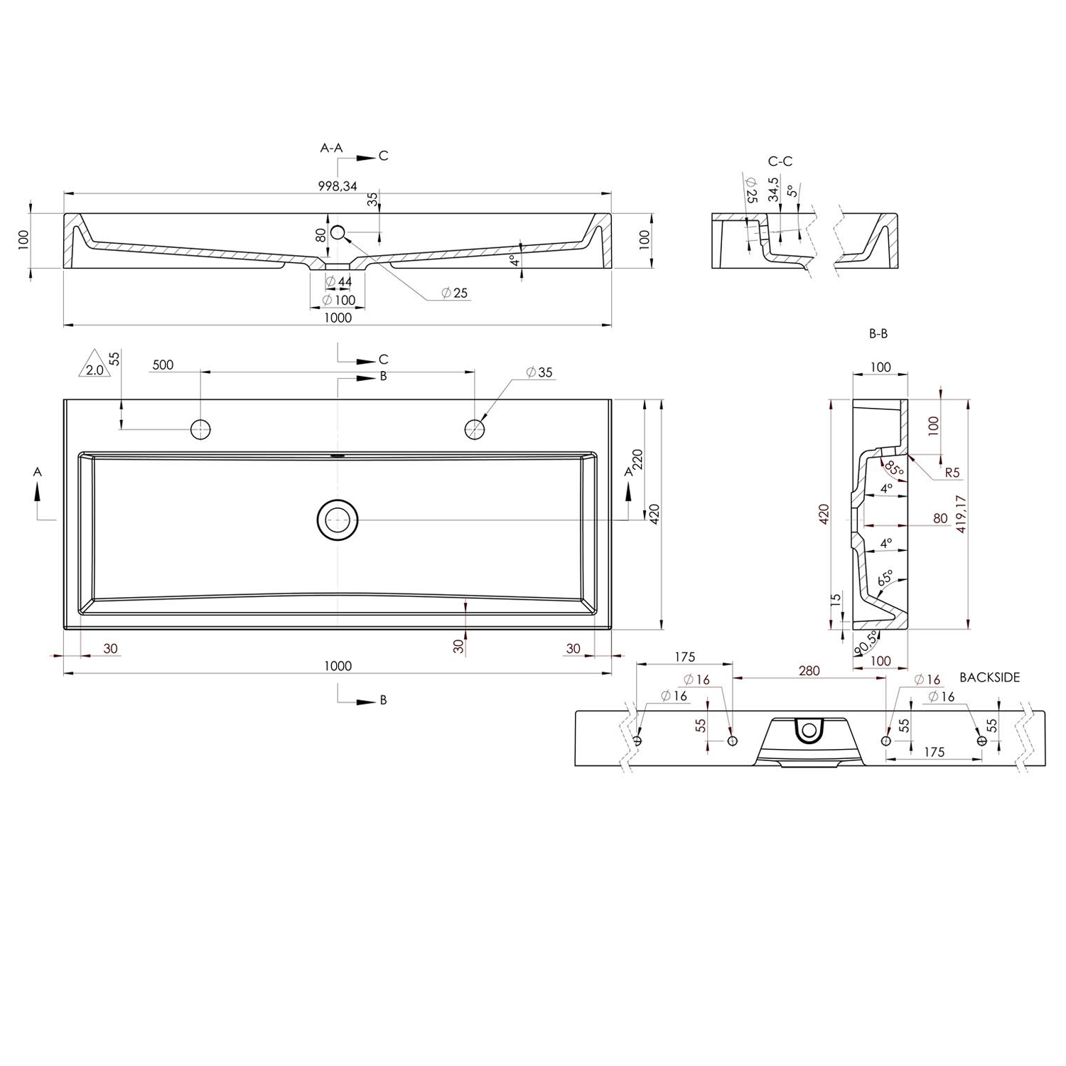OR100 ORINOKO öntöttmárvány mosdó, 100x10x42cm
