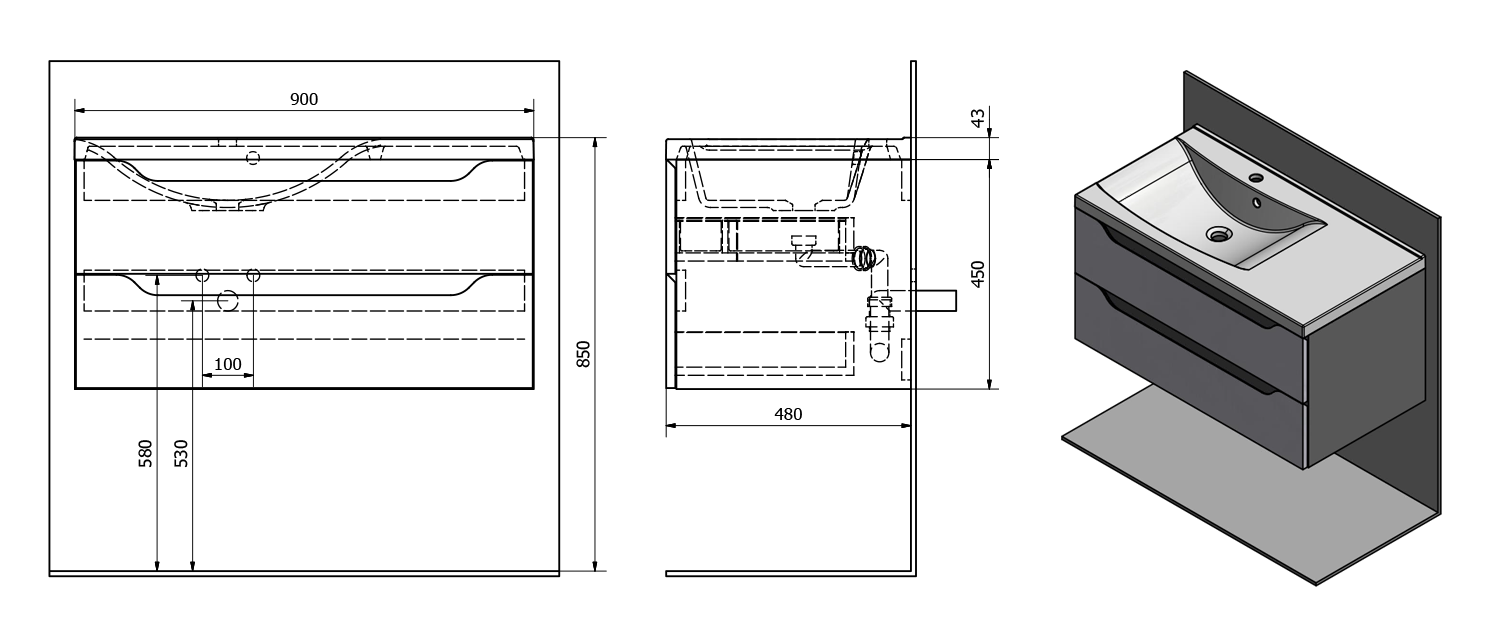 WA093-3022 WAVE II mosdótartó szekrény, 2 fiókkal, pipererendezővel, jobbos, 90x45x48cm, fehér