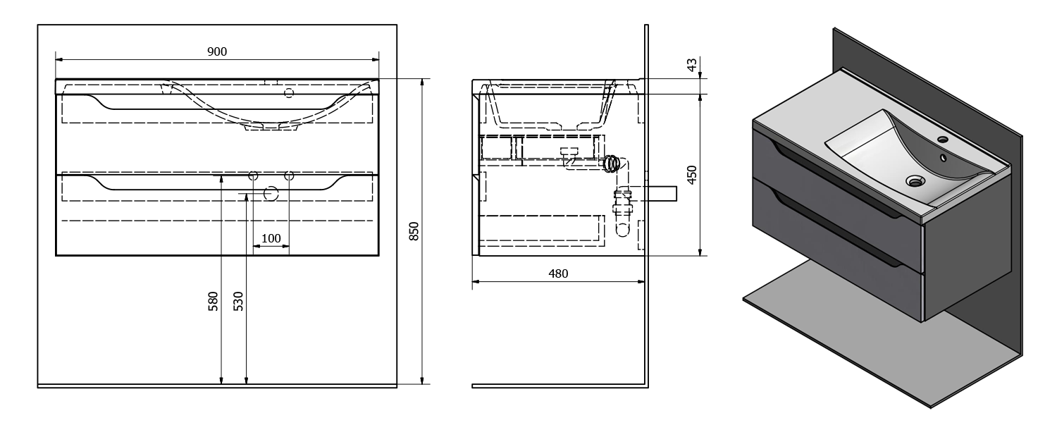 WA093-3022 WAVE II mosdótartó szekrény, 2 fiókkal, pipererendezővel, jobbos, 90x45x48cm, fehér