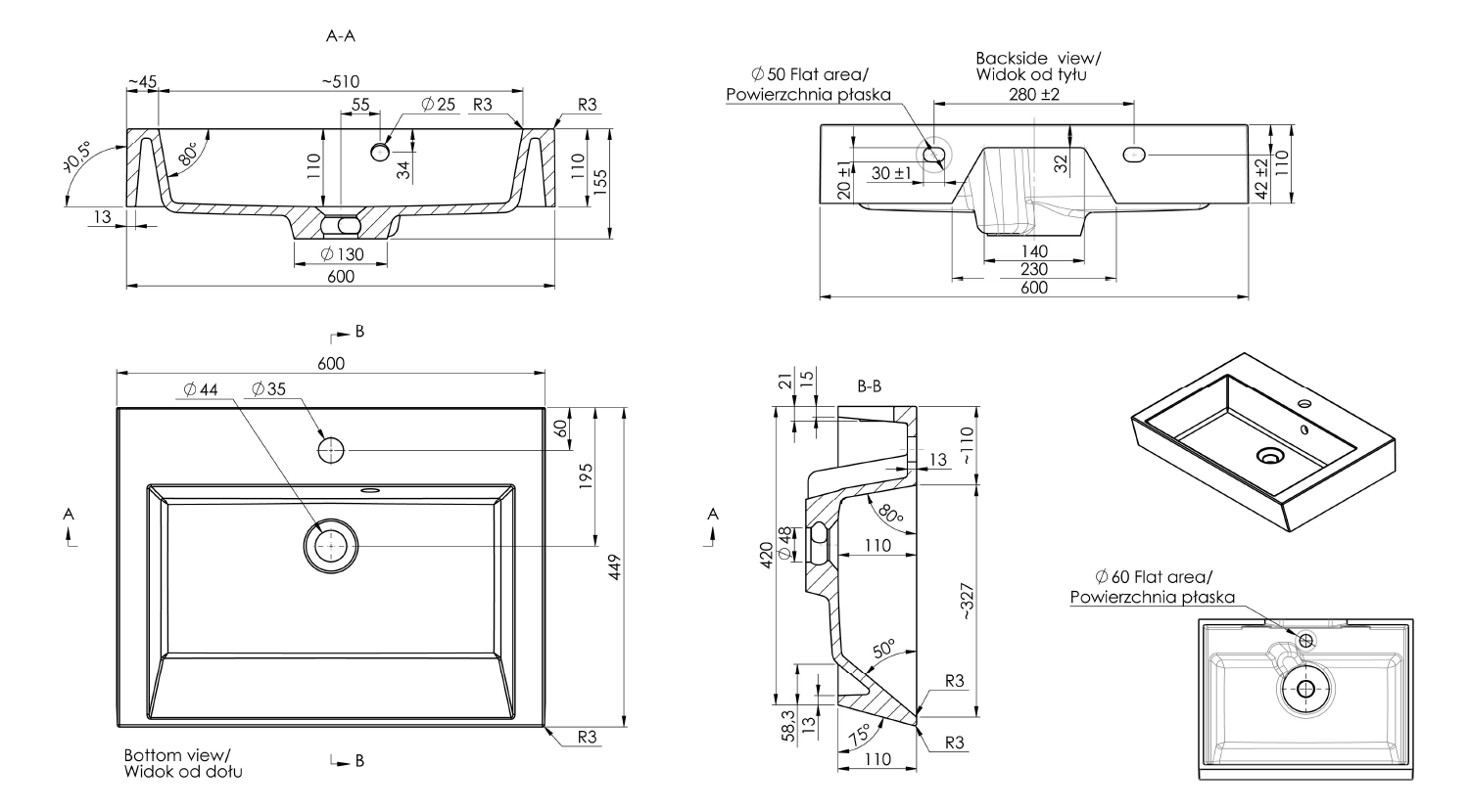 OR060 ORINOKO öntöttmárvány mosdó, 60x45cm