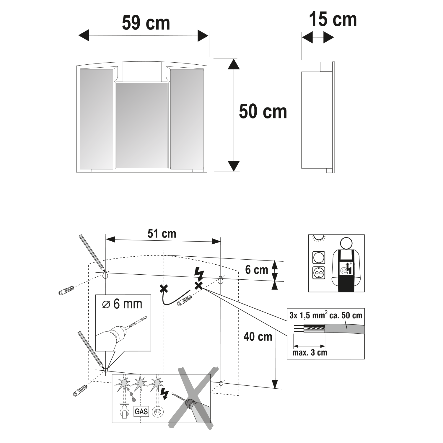 591322 AQUALINE SAPHIR tükrösszekrény, húzókapcsolóval, 60x51x18cm, 15W, G13, fehér, műanyag