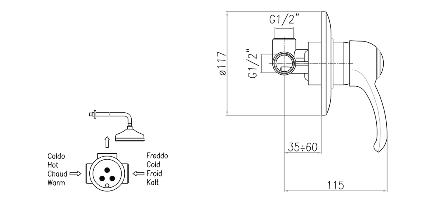 KI42B-02 KIRKÉ falba süllyesztett csaptelep, 2-irányú váltóval, zunayszettel, fejzuhannyal, bronz