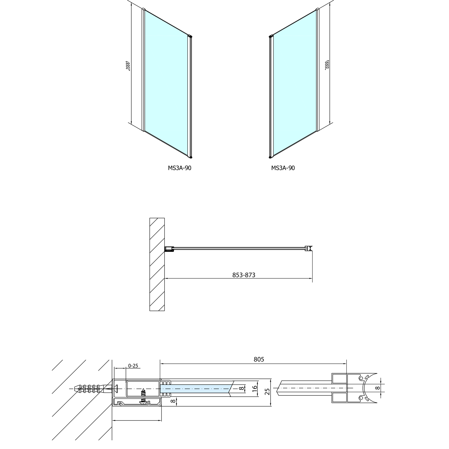 MS3A-90 POLYSAN MODULAR Fix zuhanyfal, L típusú, ajtós változat, 2/1-es modul, 900mm, transzparent üveg