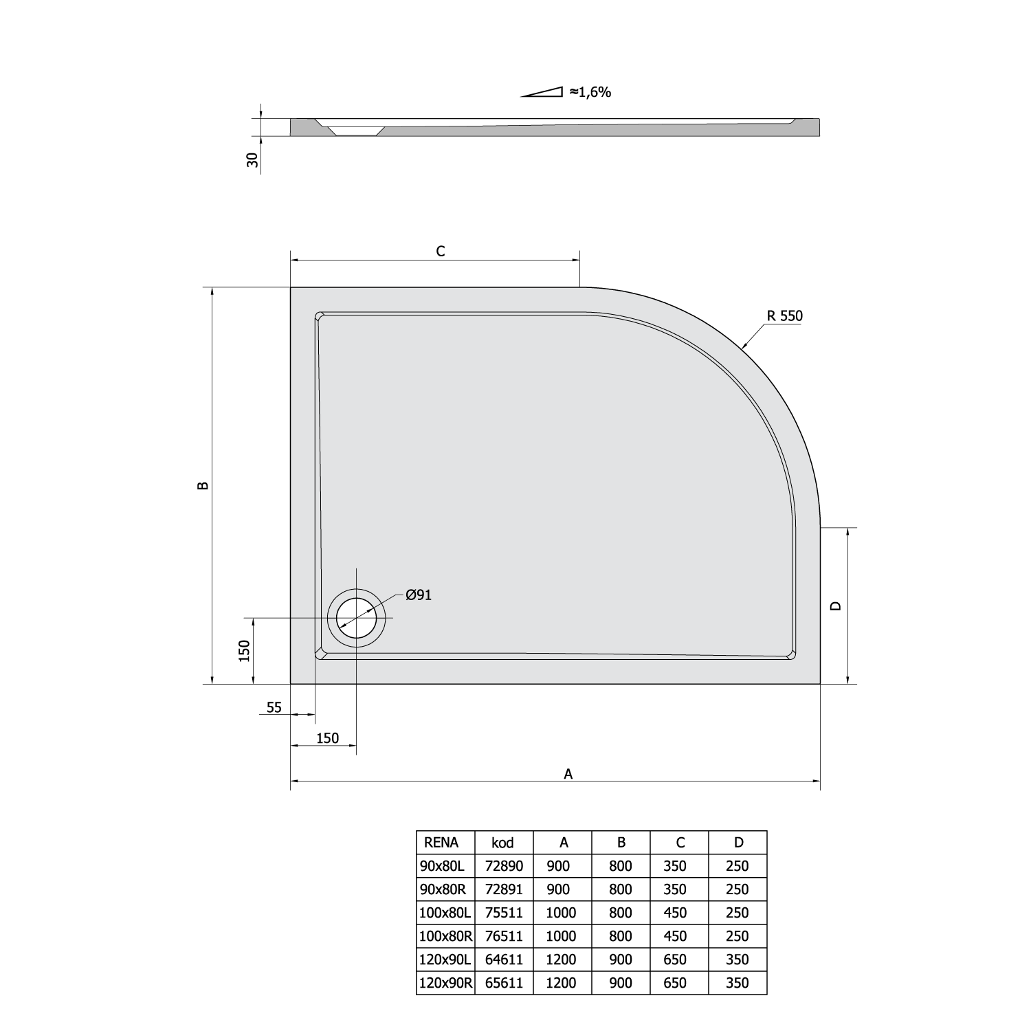 72890 POLYSAN RENA öntöttmárvány zuhanytálca, 90x80x4cm, R550, bal