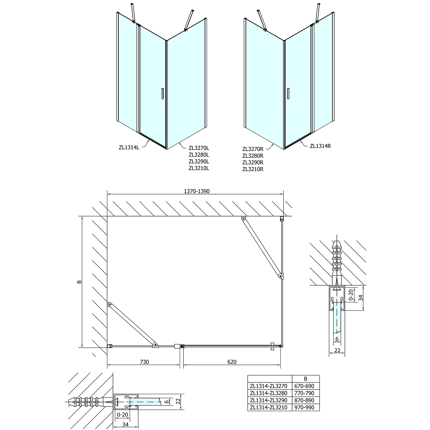 ZL1313ZL3210 POLYSAN ZOOM LINE zuhanyajtó és oldalfal, jobbos/balos, 1300x1000mm, transzparent, króm