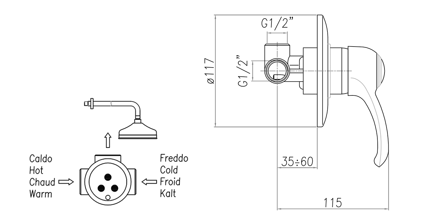 KI42B-02 KIRKÉ falba süllyesztett csaptelep, 2-irányú váltóval, zunayszettel, fejzuhannyal, bronz