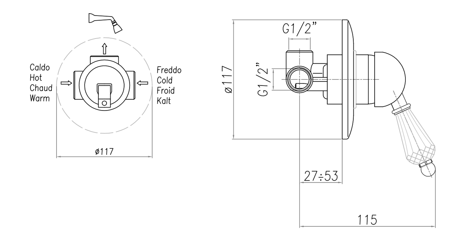 KI42KC KIRKÉ falsík alatti zuhanycsaptelep, 2-irányú váltóval, kristály karral, króm