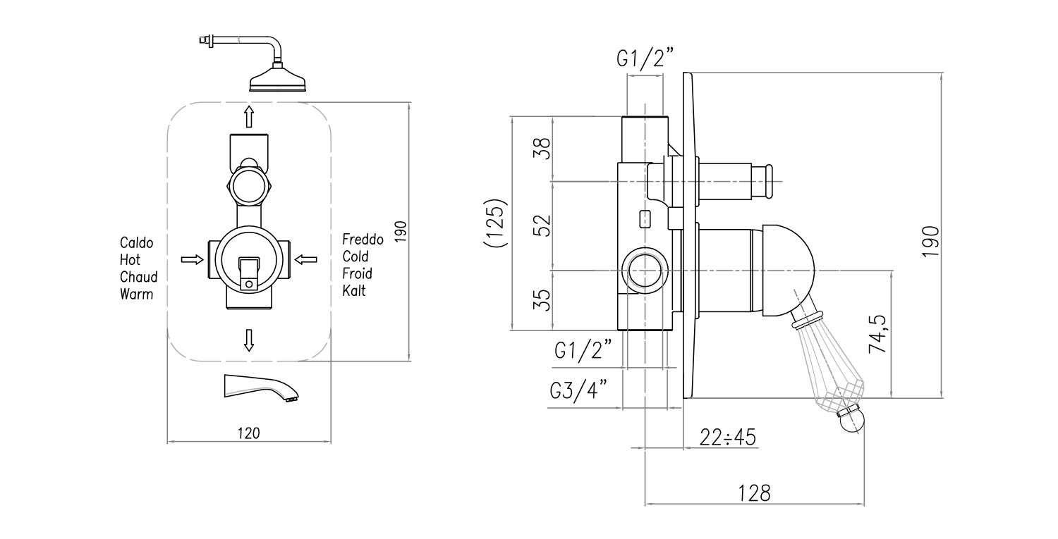 KI42KC KIRKÉ falsík alatti zuhanycsaptelep, 2-irányú váltóval, kristály karral, króm