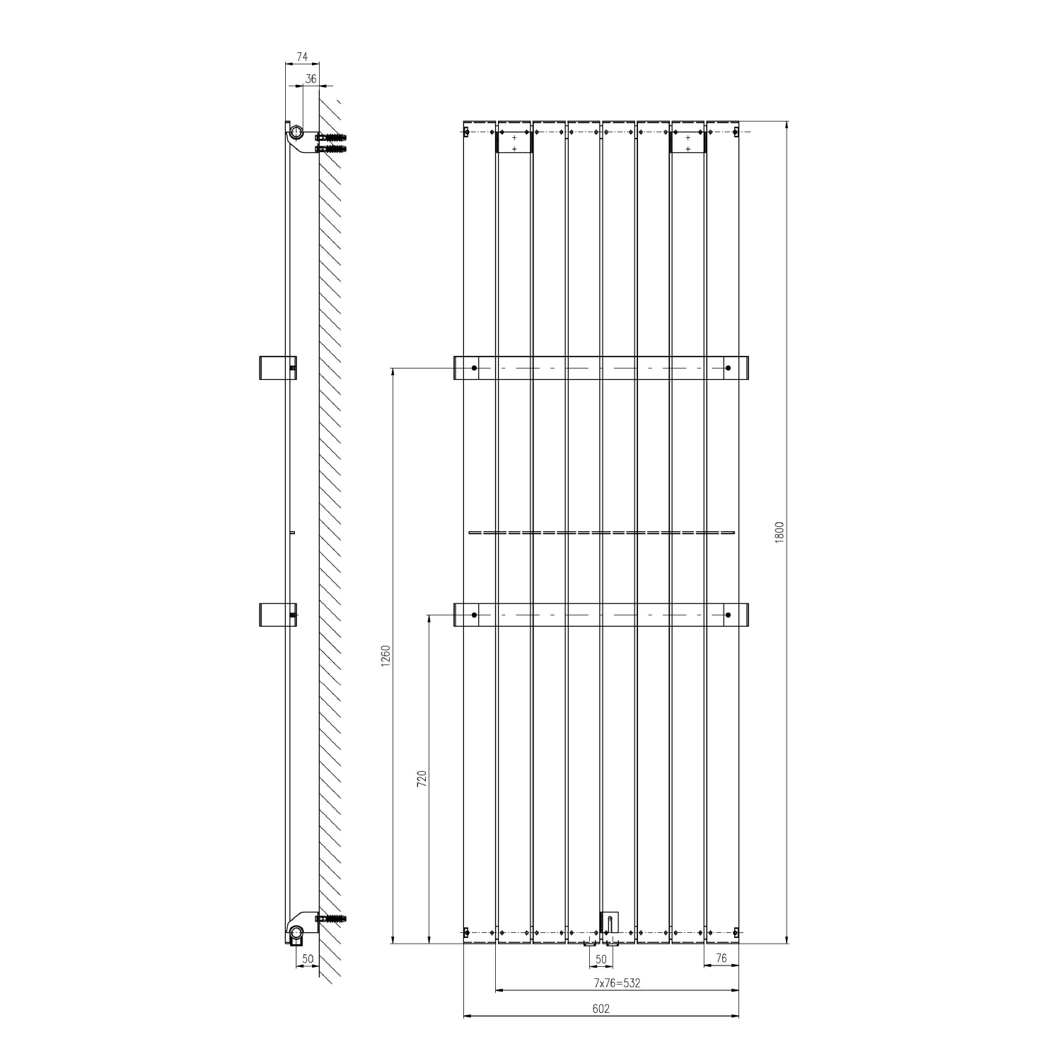 Towel rail with a 50 mm connection spacing