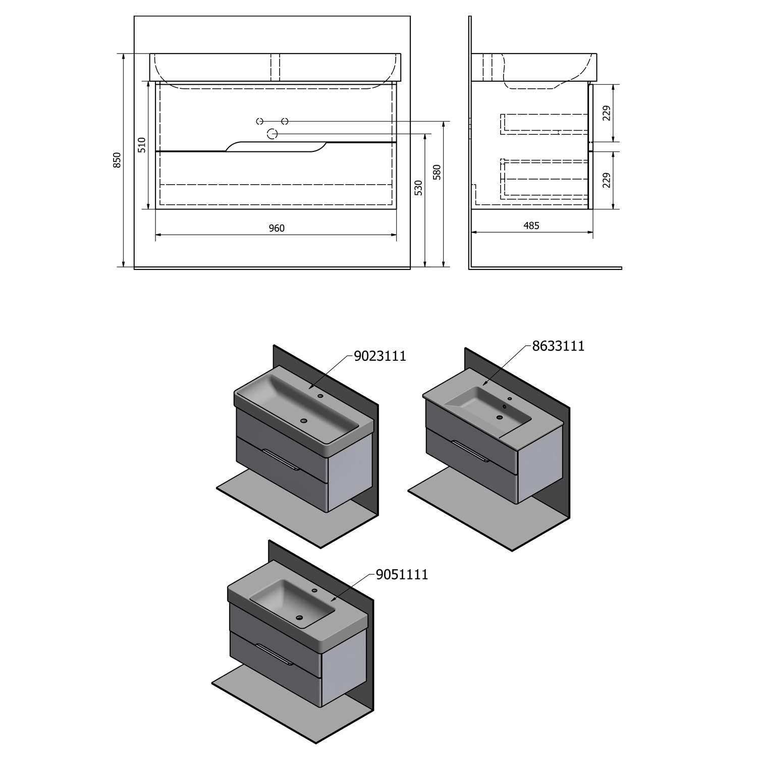 MD061 MEDIENA mosdótartó szekrény, 2 fiókkal, 57x50,7x48,5cm, matt fehér/grafit tölgy