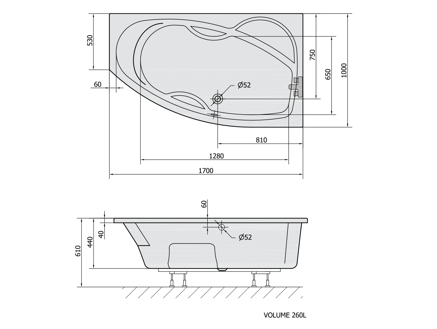 22611 POLYSAN EVIA aszimmetrikus kád, jobbos, 170x100x47cm