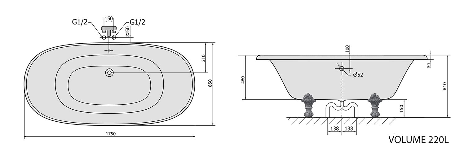10271 POLYSAN REGATA szabadonálló kád, 175x85x61cm, bronz lábak, fekete/fehér