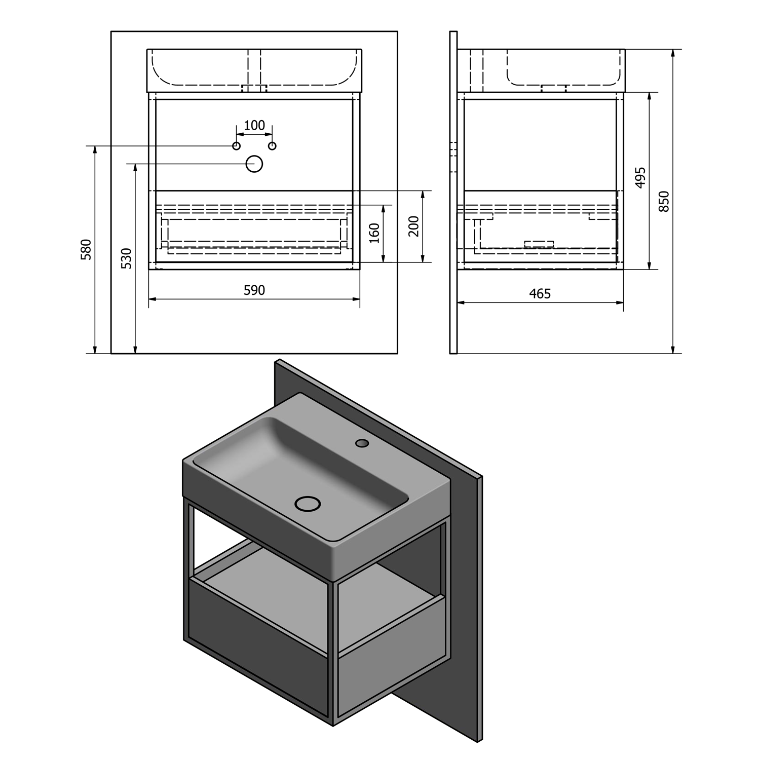 CG009-1919 SKARA fali mosdótartó szekrény, matt fekete kerettel, 100x50x45cm, collingwood tölgy