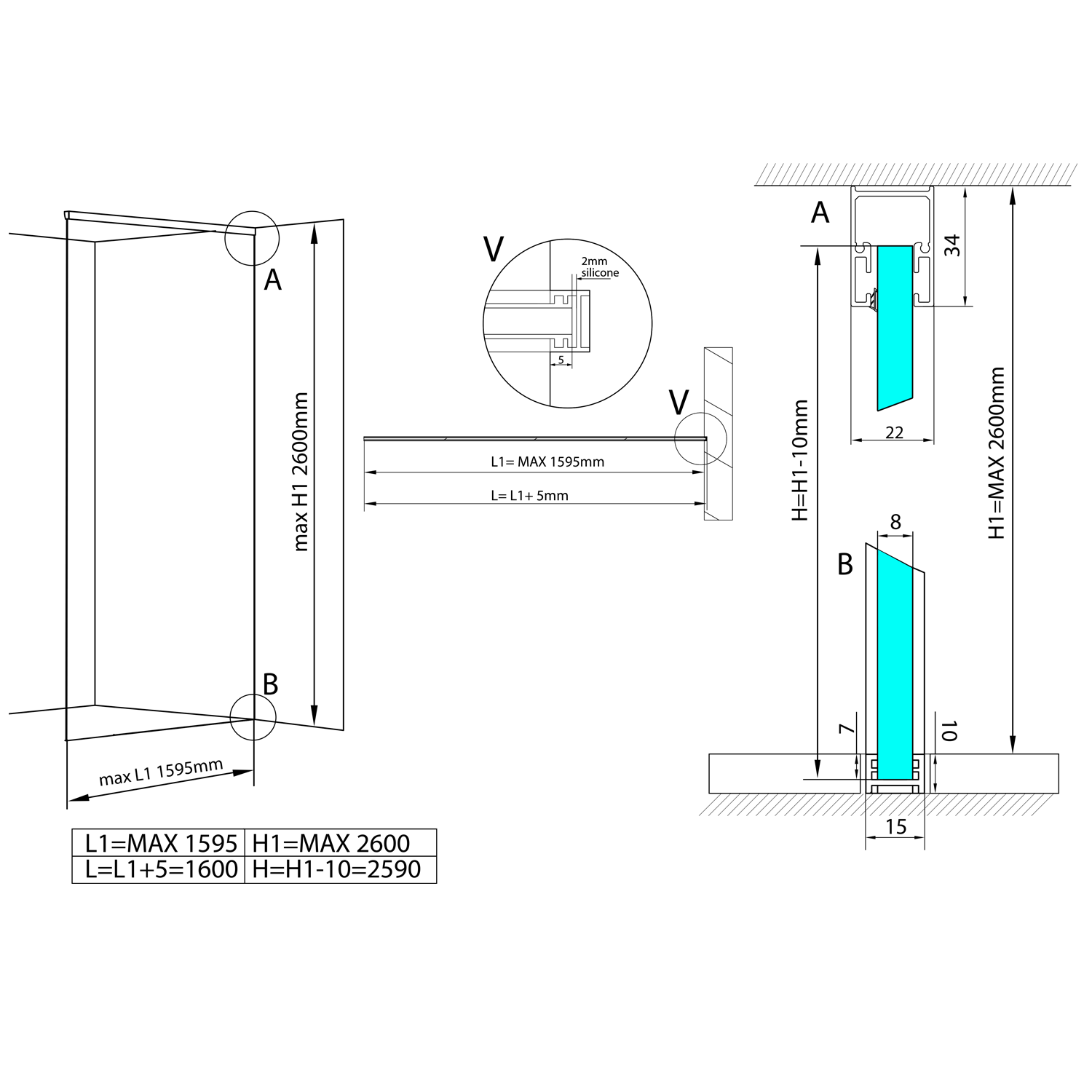 AL2116B ARCHITEX rögzítő szett padlóhoz és falhoz, 1610x2105mm, matt fekete