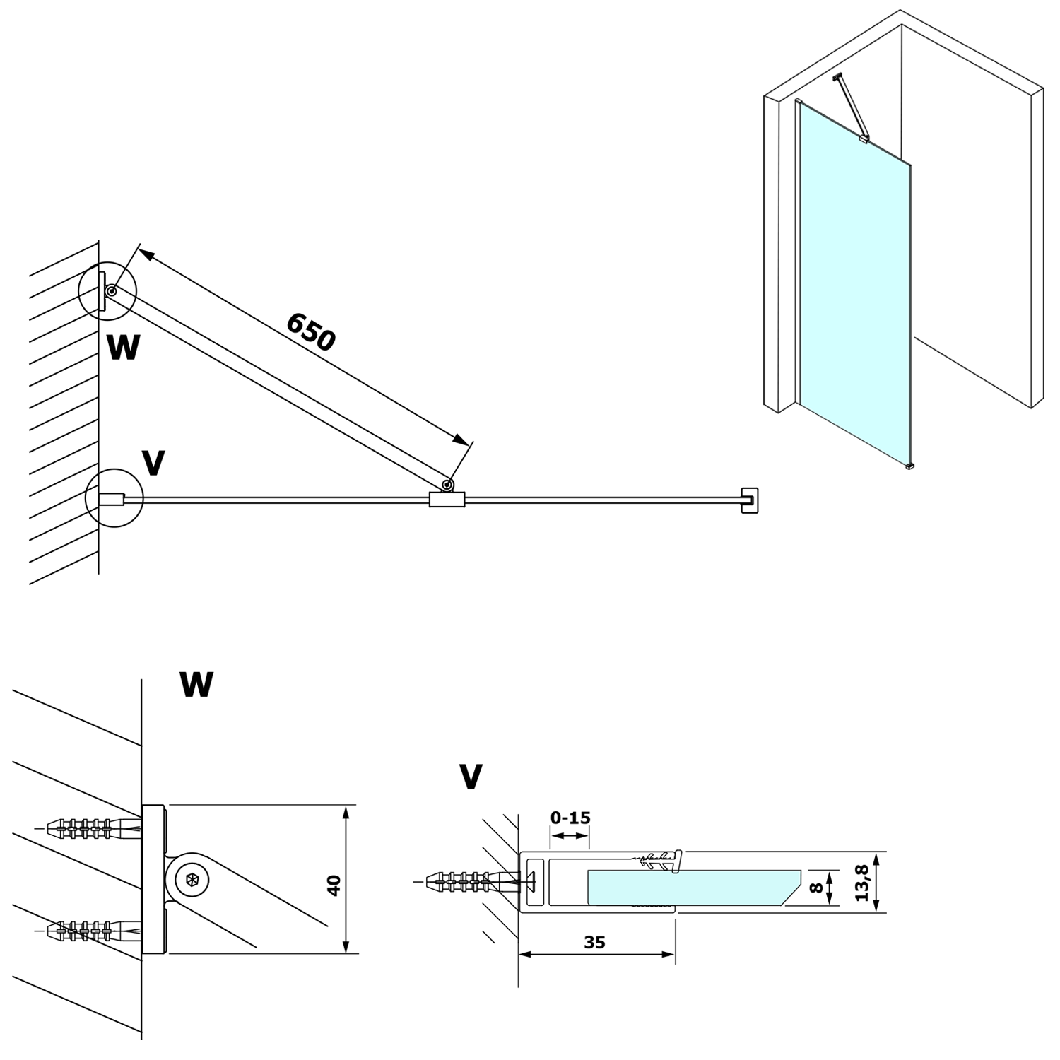 GX1570-06 VARIO BLACK Fix zuhanyfal, fali profillal, merőleges merevítő nélkül, nordic üveg, 700mm