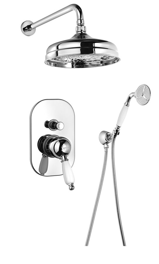 KIRKÉ falba süllyesztett csaptelep, 2-irányú váltóval, fehér kerámia karral, zuhanyszettel, fejzuhannyal, króm (KI42BC-01)