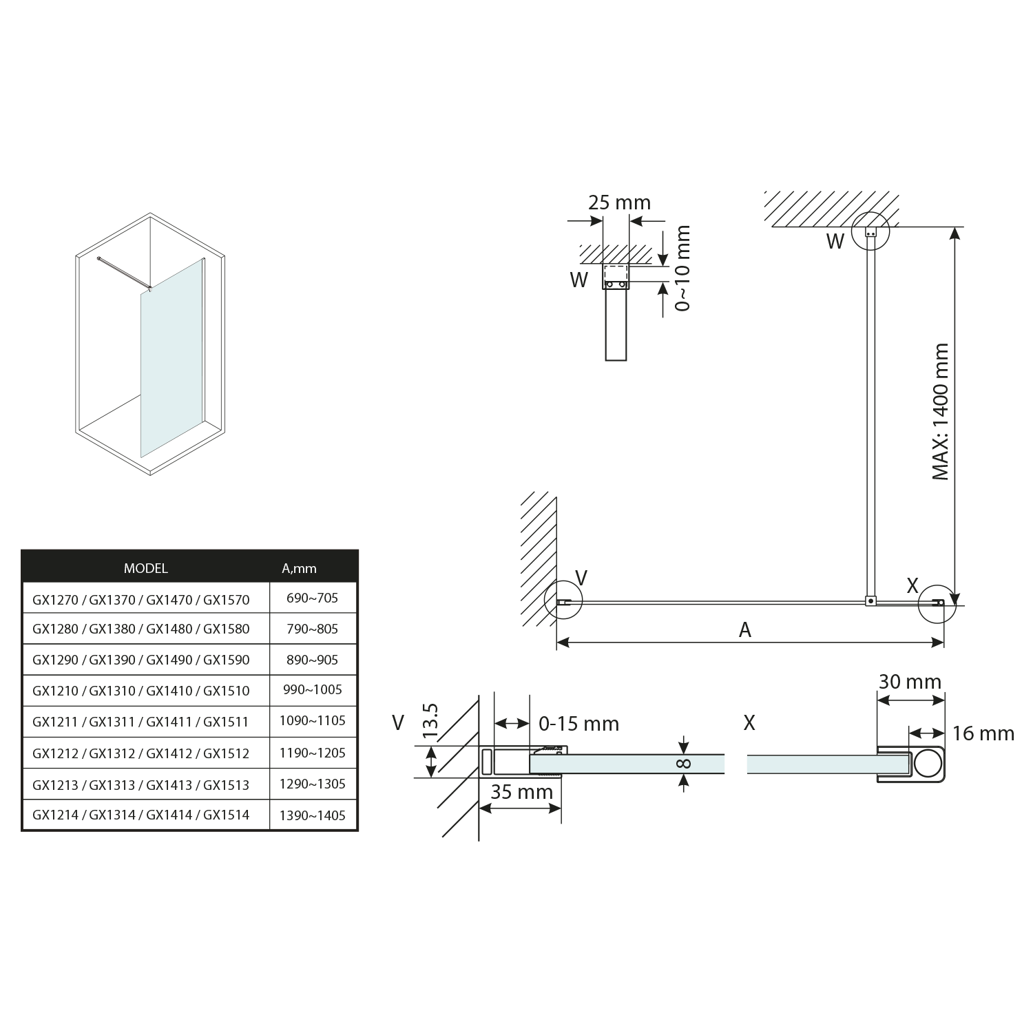 GX2214 GELCO VARIO Walk-In merevítő, 1400mm, matt fekete