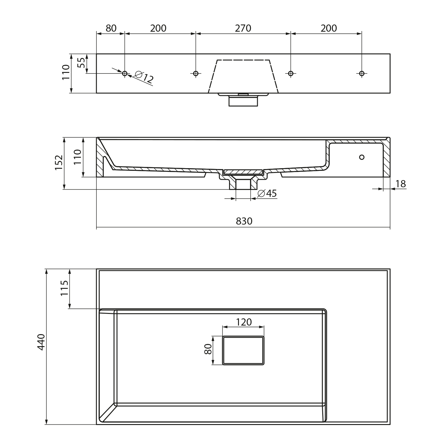 GU083L-0 GODIVA öntöttmárvány mosdó, csaplyuk nélkül, 83x44cm