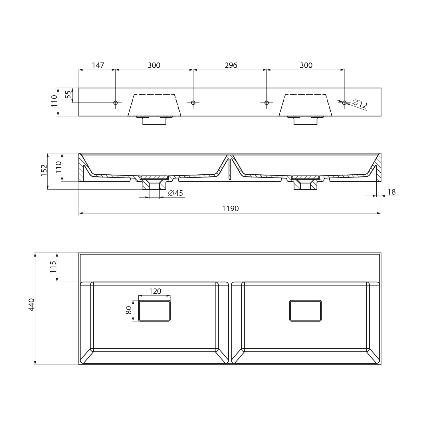 GODIVA öntöttmárvány mosdó, csaplyuk nélkül, 119x44cm (GU119-0)