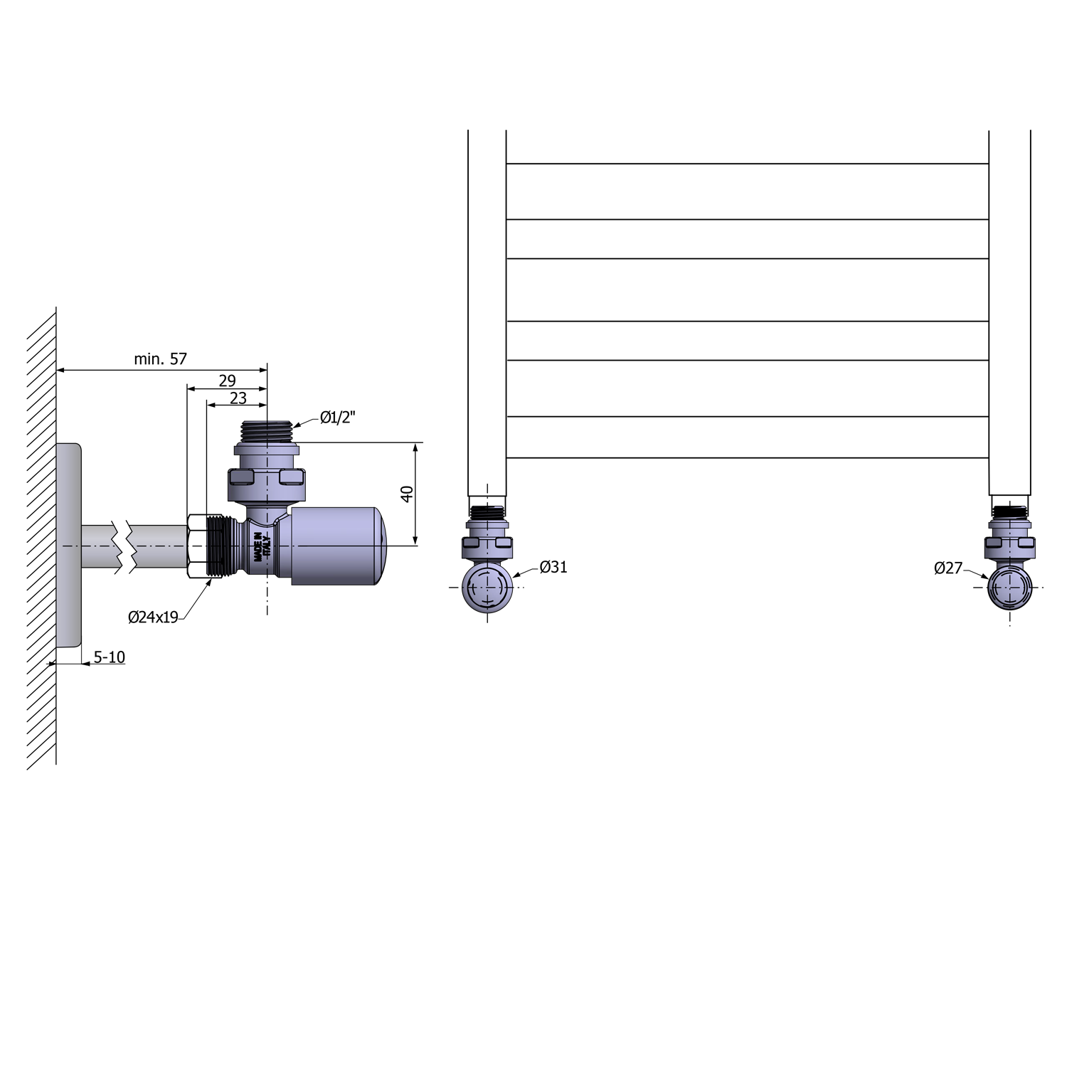 The connection valves we offer are supplied with a clamping fitting for the most common pipes (O15 mm for copper and O16 mm for Alupex), so there is no need to buy anything else for the connection. For covering the inlet pipes and holes in the wall, we recommend the addition of cover rosettes.