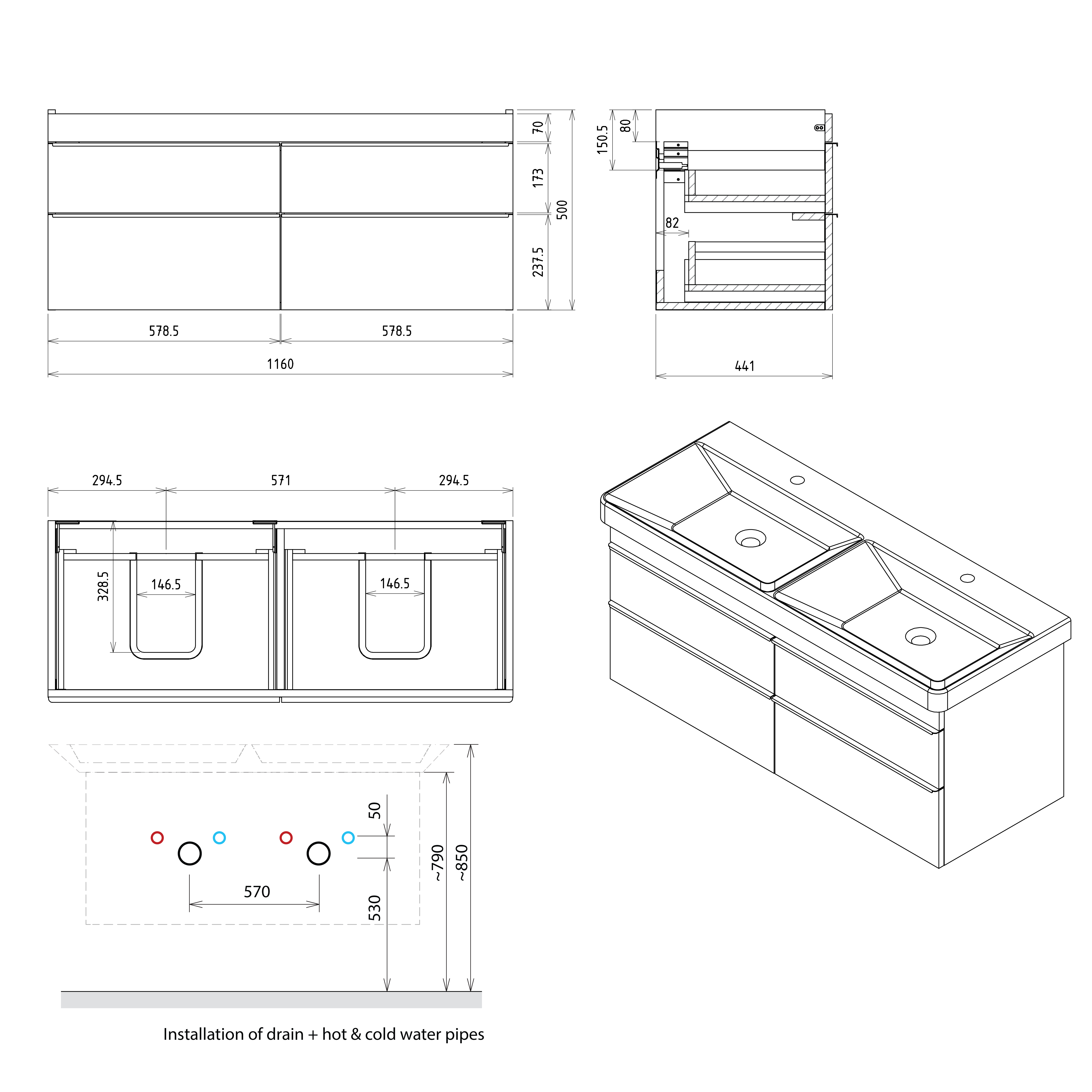 Furniture is equipped travels drawers with slow release and an automatic closing movement drawers. No more noisy closing.
