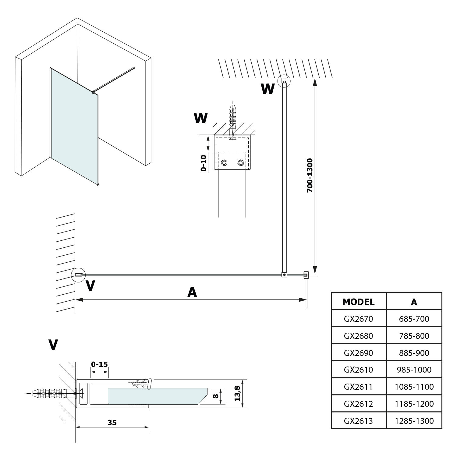 GX1570-06 VARIO BLACK Fix zuhanyfal, fali profillal, merőleges merevítő nélkül, nordic üveg, 700mm