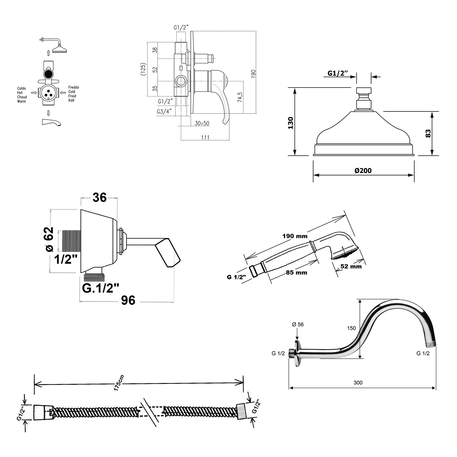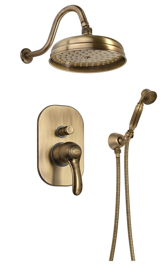 KI42B-02 KIRKÉ falba süllyesztett csaptelep, 2-irányú váltóval, zunayszettel, fejzuhannyal, bronz