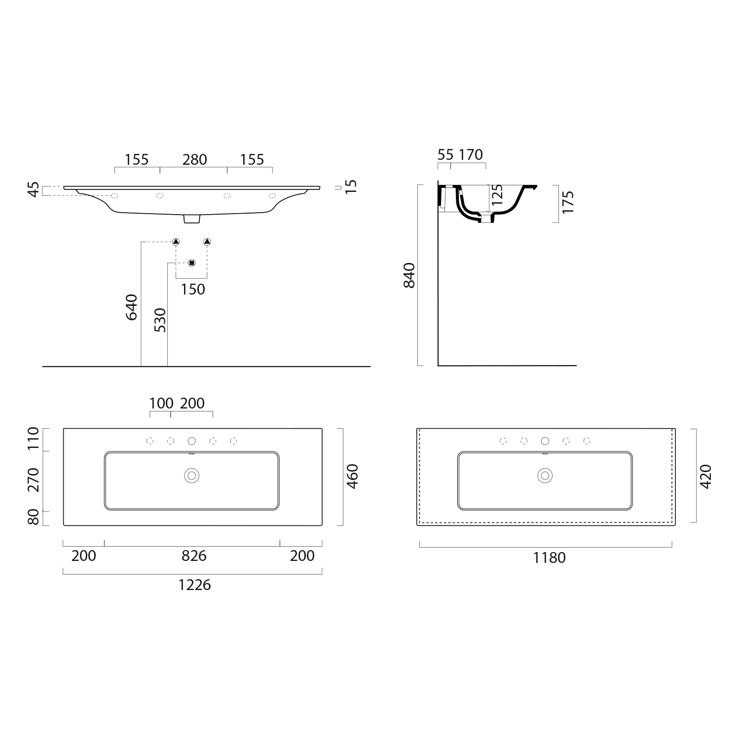 8887226 GSI PURA SLIM kerámiamosdó, 122,6x46cm, 2 furattal, matt fekete