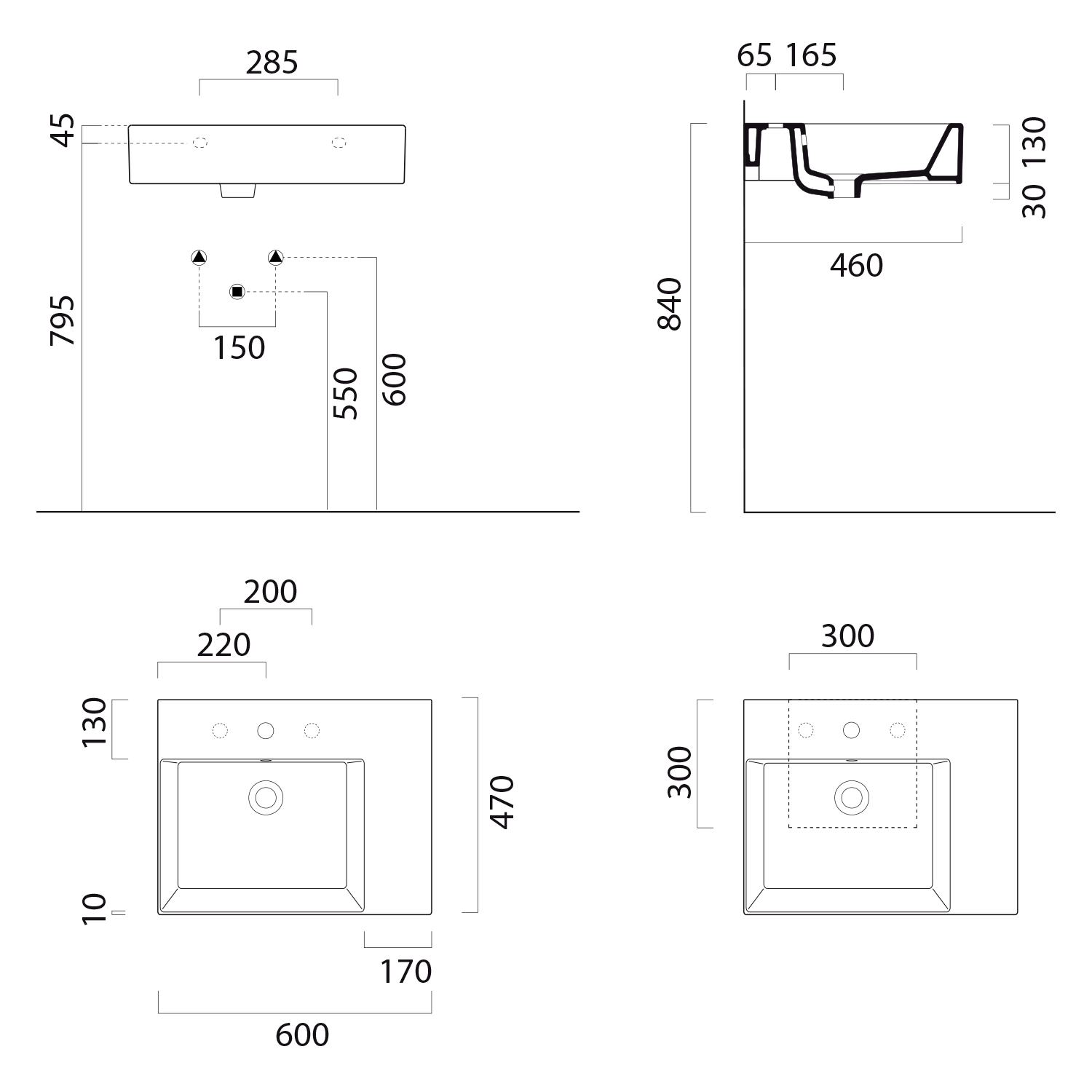 94319311 GSI KUBE X kerámiamosdó, 60x47cm, csiszolt alsó élekkel, 3 furattal, ExtraGlaze