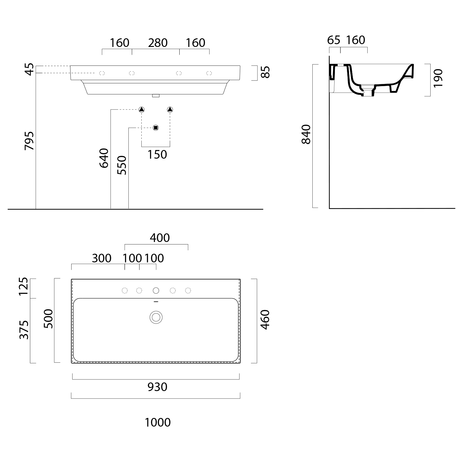 9651311 GSI NUBES kerámiamosdó, 100x50cm, 3 furattal, ExtraGlaze