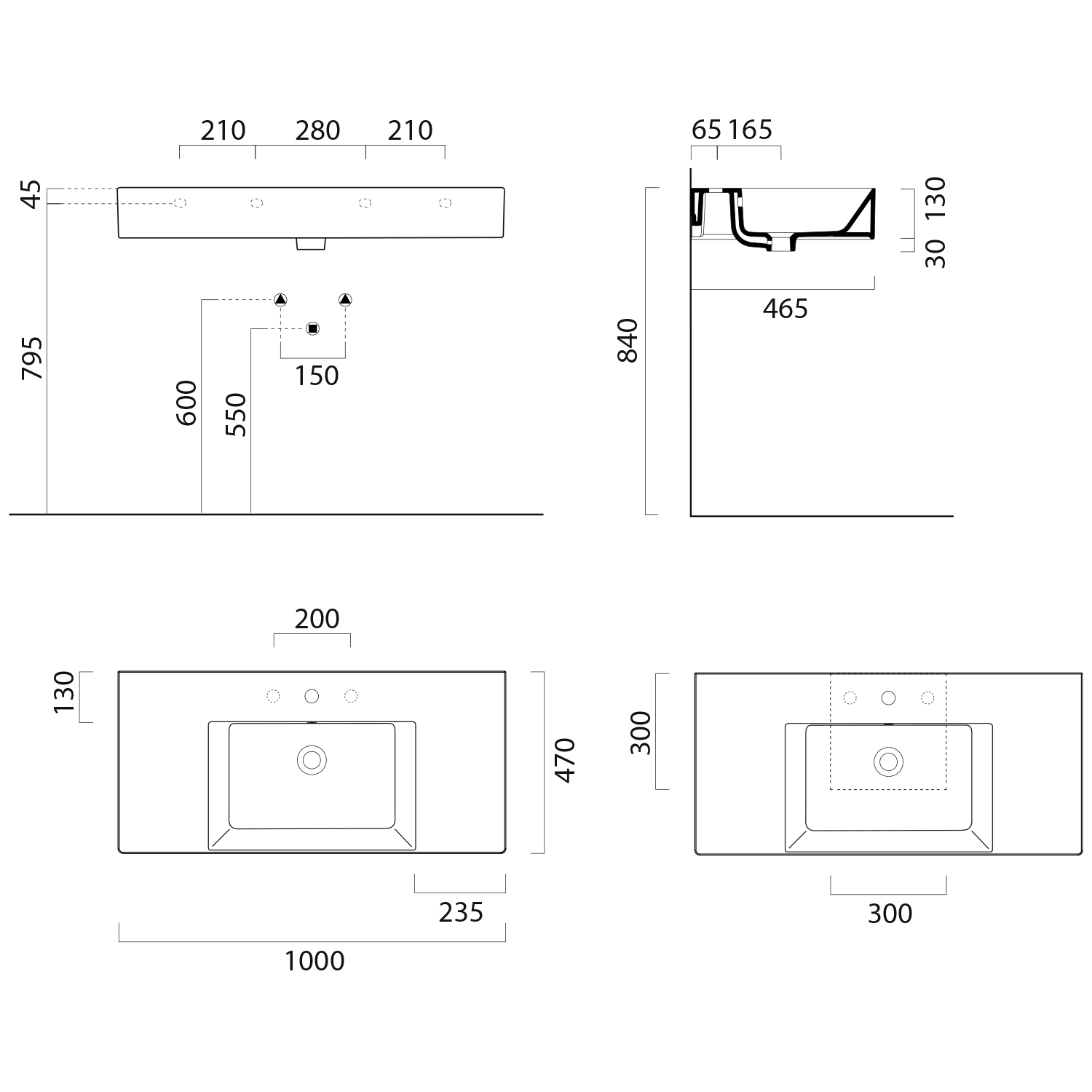 94519311 GSI KUBE X kerámiamosdó, 100x47cm, csiszolt alsó élekkel, 3 furattal, ExtraGlaze
