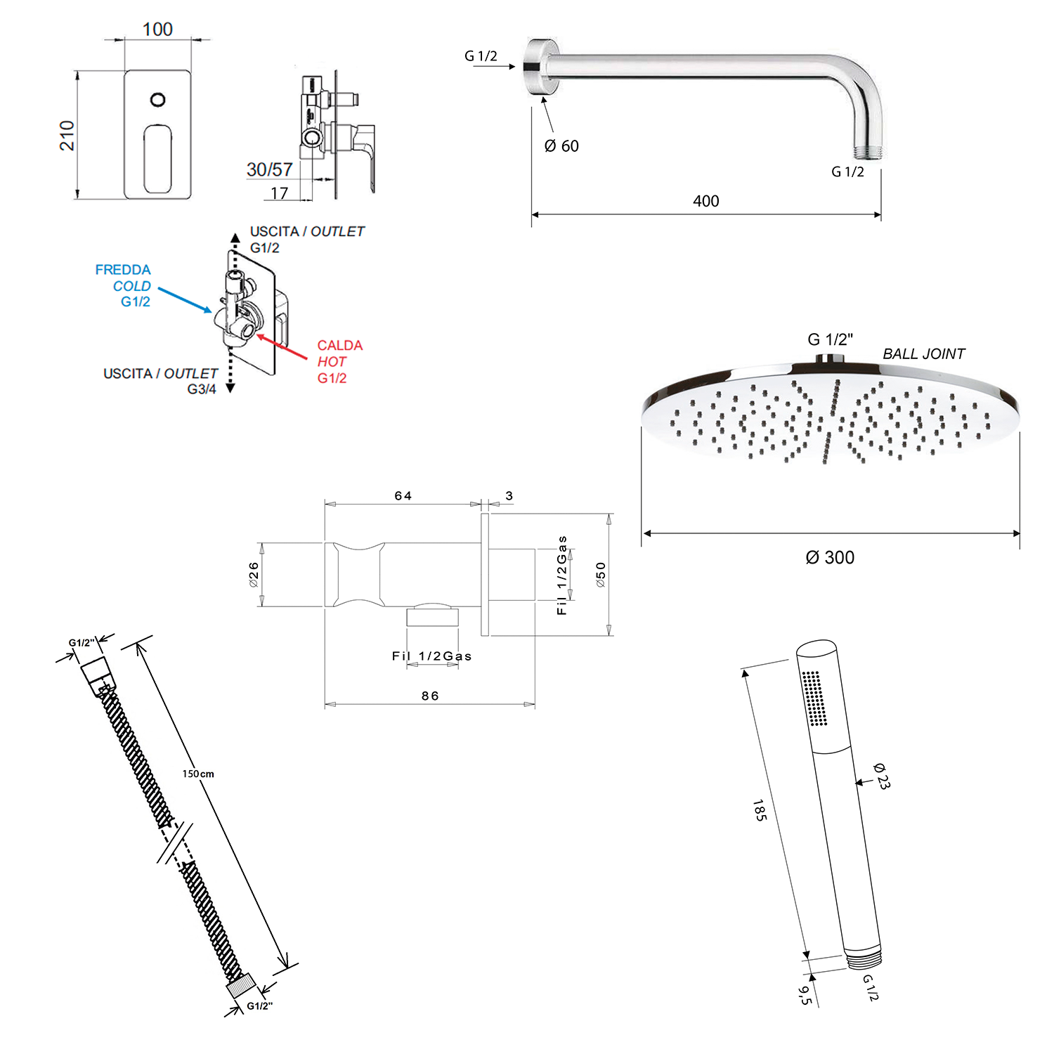 PY42-01 SPY falba süllyesztett zuhanycsaptelep, 2-irányú váltóval, zuhanyszettel, fejzuhannyal, króm