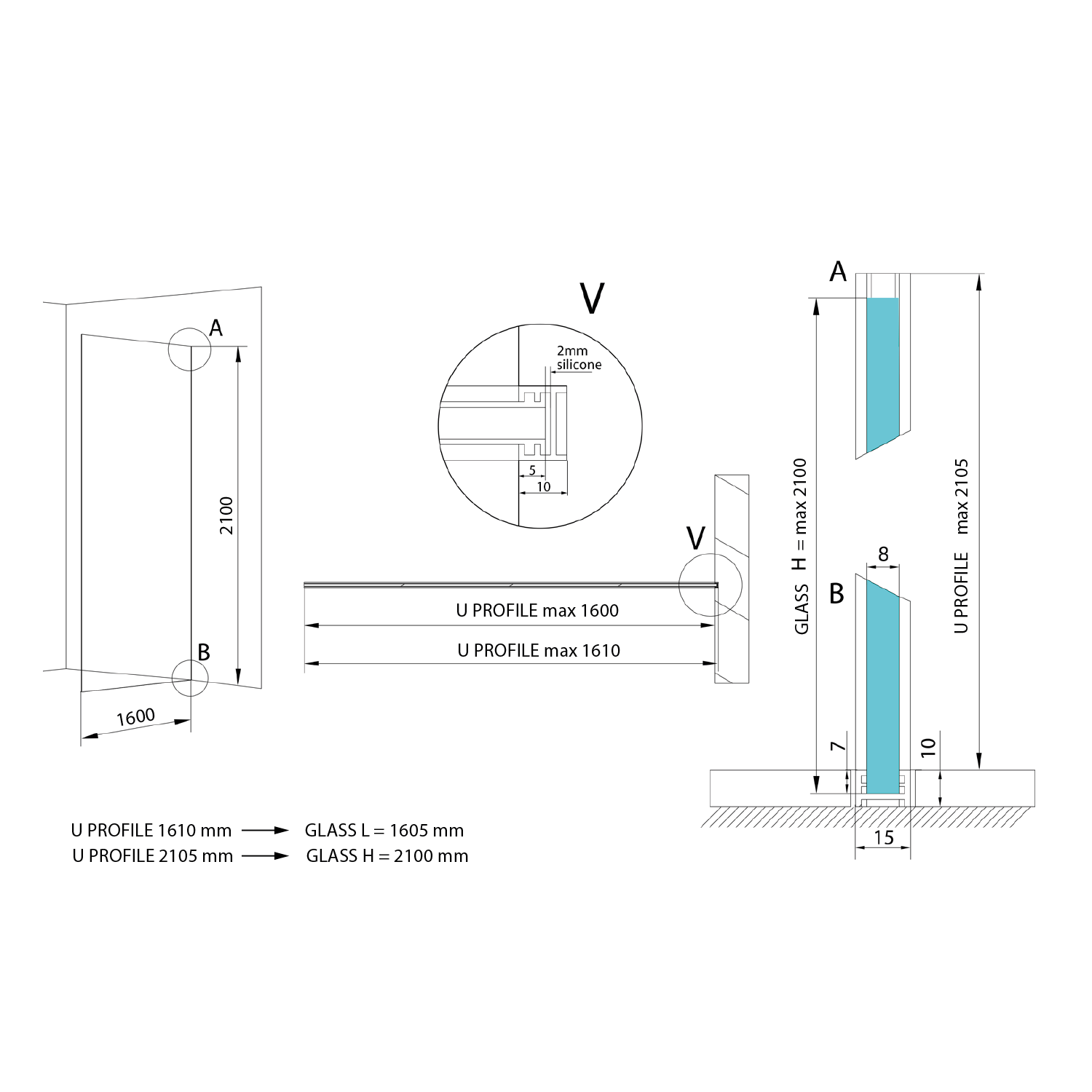AL2116B ARCHITEX rögzítő szett padlóhoz és falhoz, 1610x2105mm, matt fekete