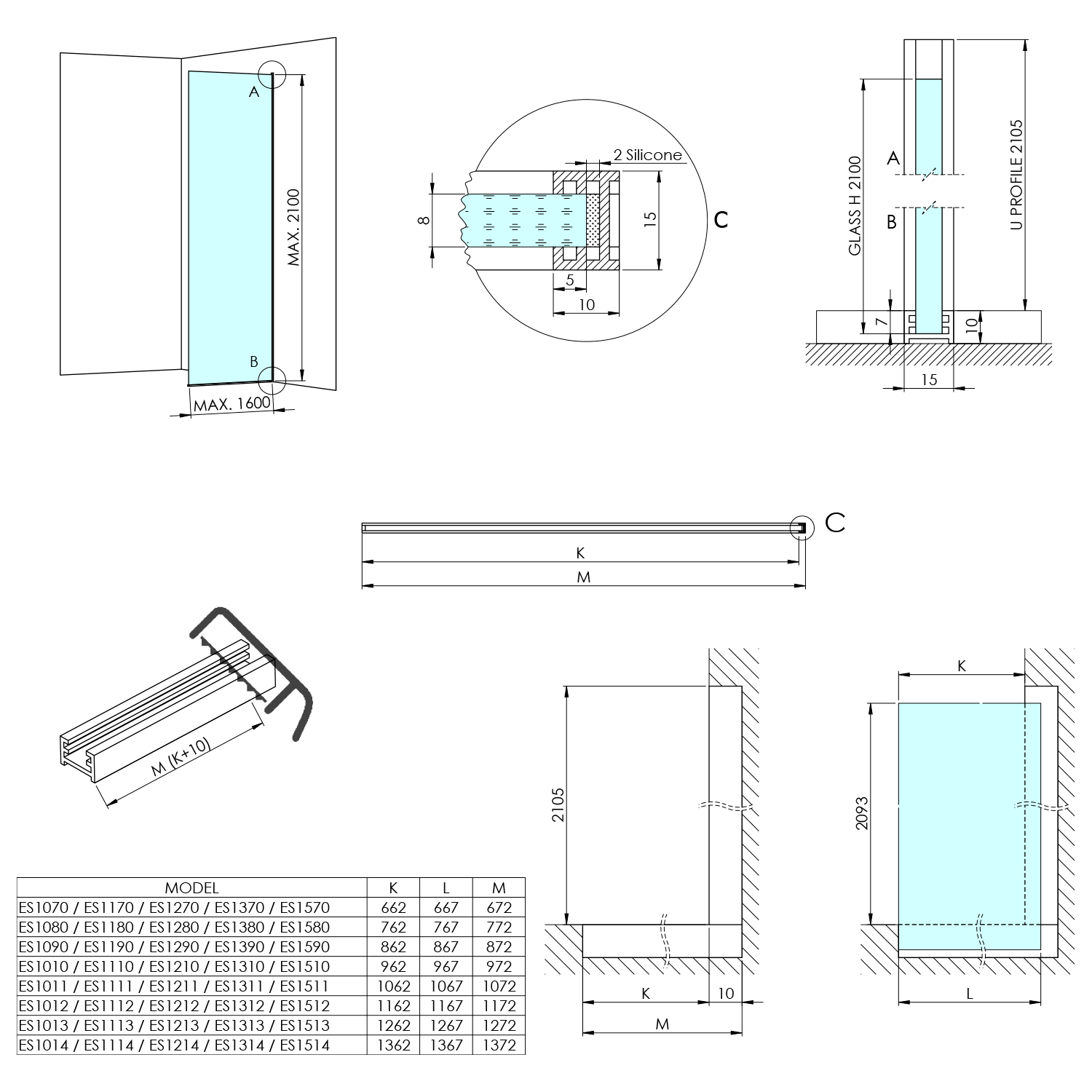 AL2116B ARCHITEX rögzítő szett padlóhoz és falhoz, 1610x2105mm, matt fekete