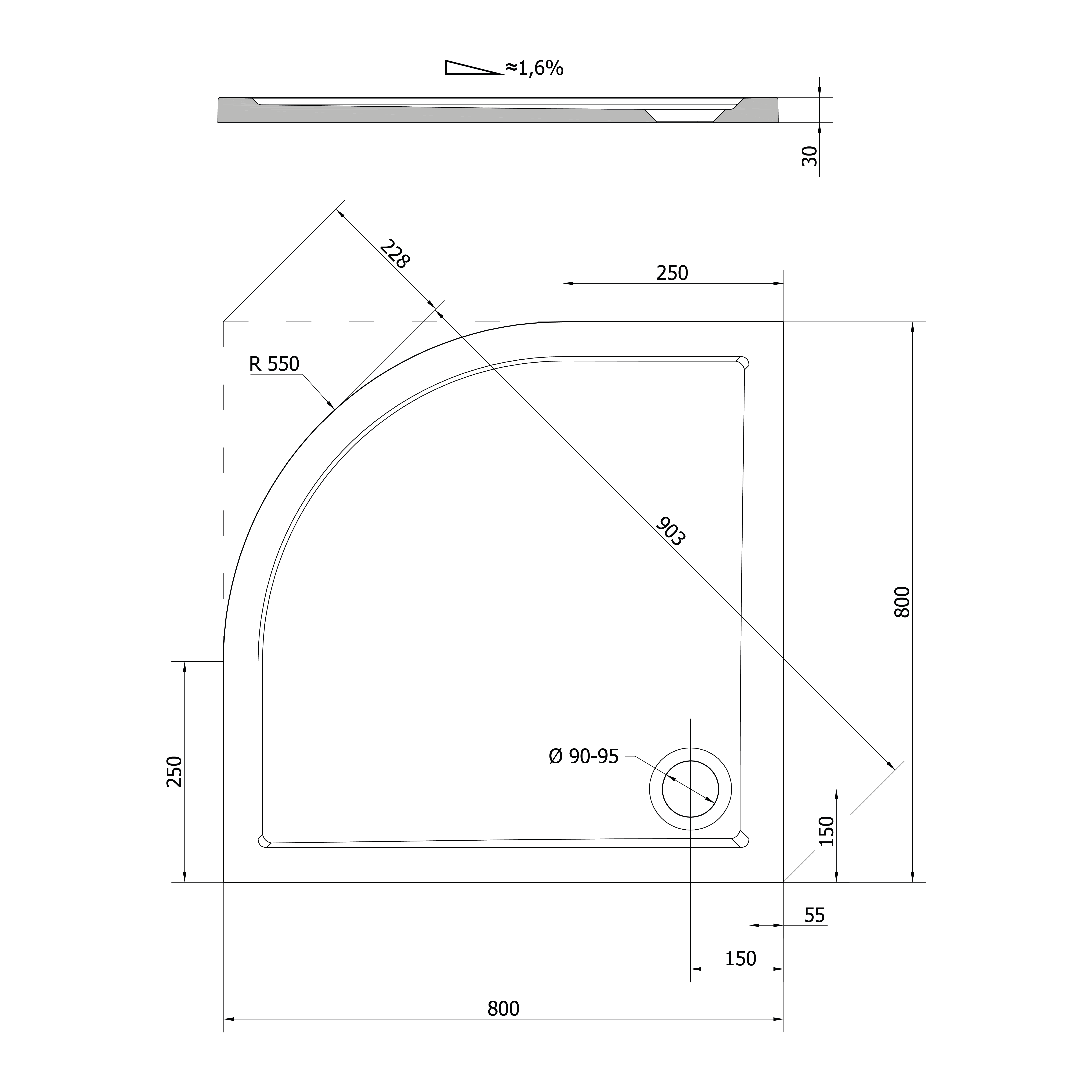 61511 POLYSAN SERA öntöttmárvány zuhanytálca, negyedköríves, 90x90x4cm, R500