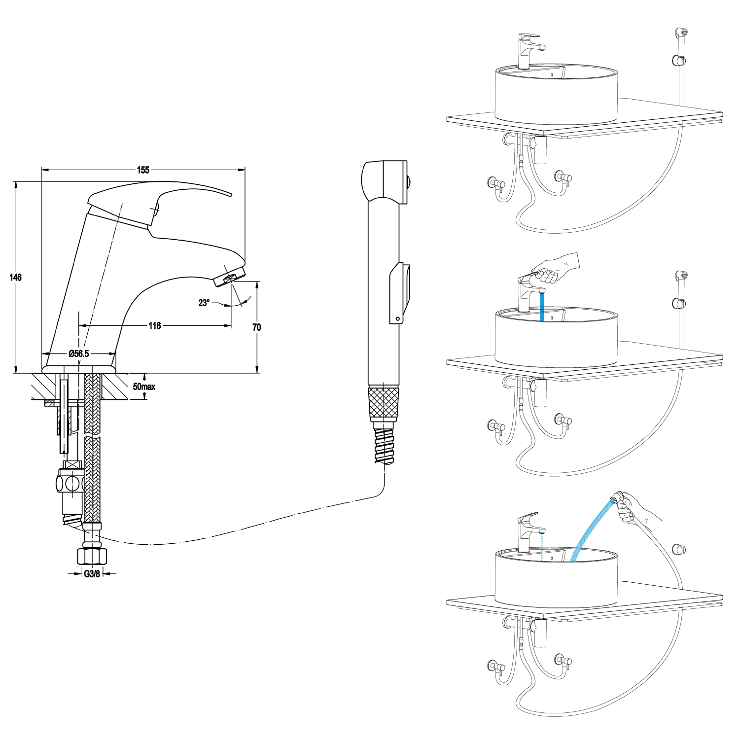 mosdócsaptelep bidé zuhannyal, tartóval és gégecsővel, vízbekötés nélkül, króm (1209-05)