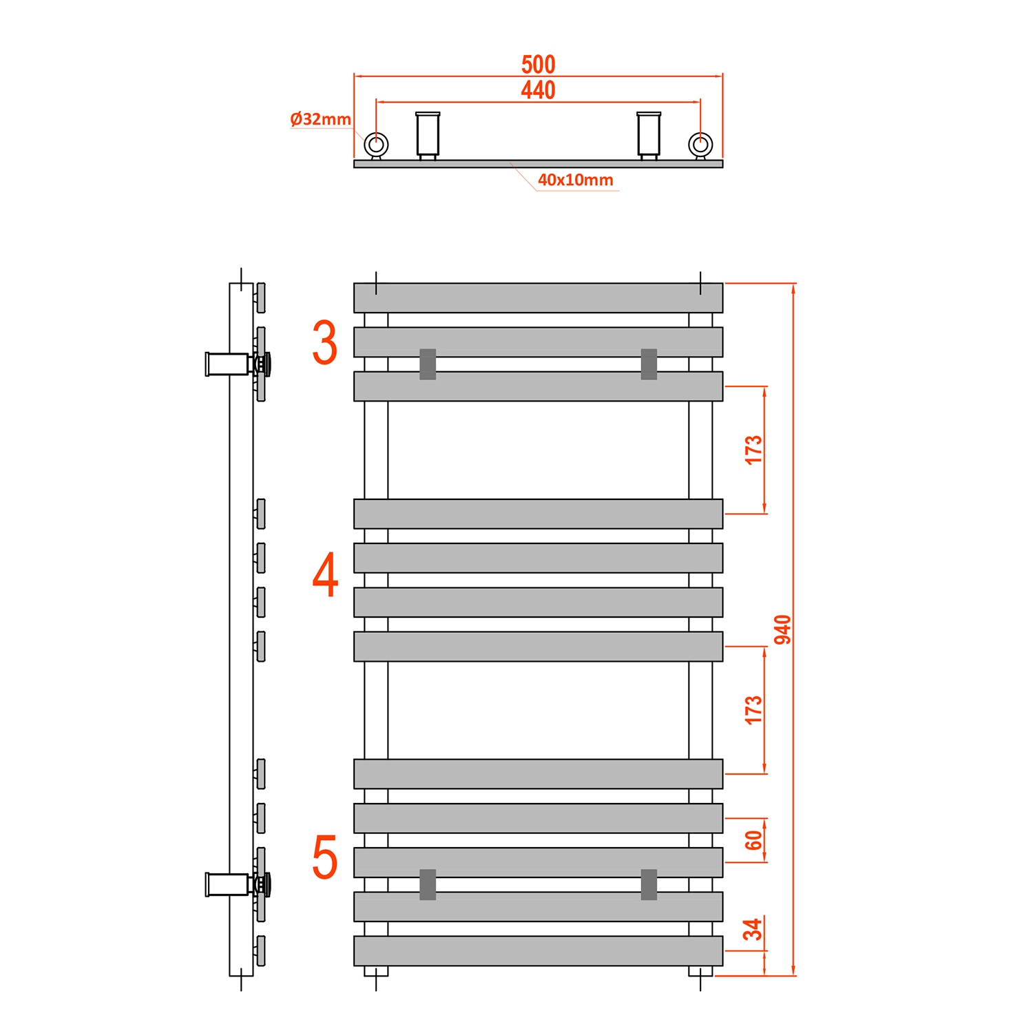 Towel rail with a 50 mm connection spacing