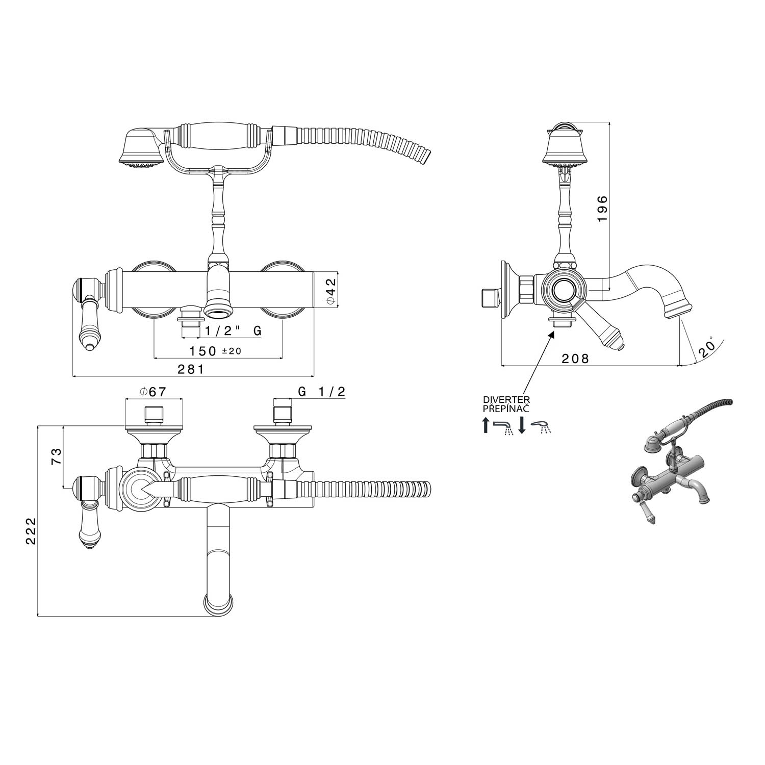 VO143 VIENNA falba süllyesztett zuhanycsaptelep, 3-irányú váltóval, zuhanyszettel és kádtöltővel, króm