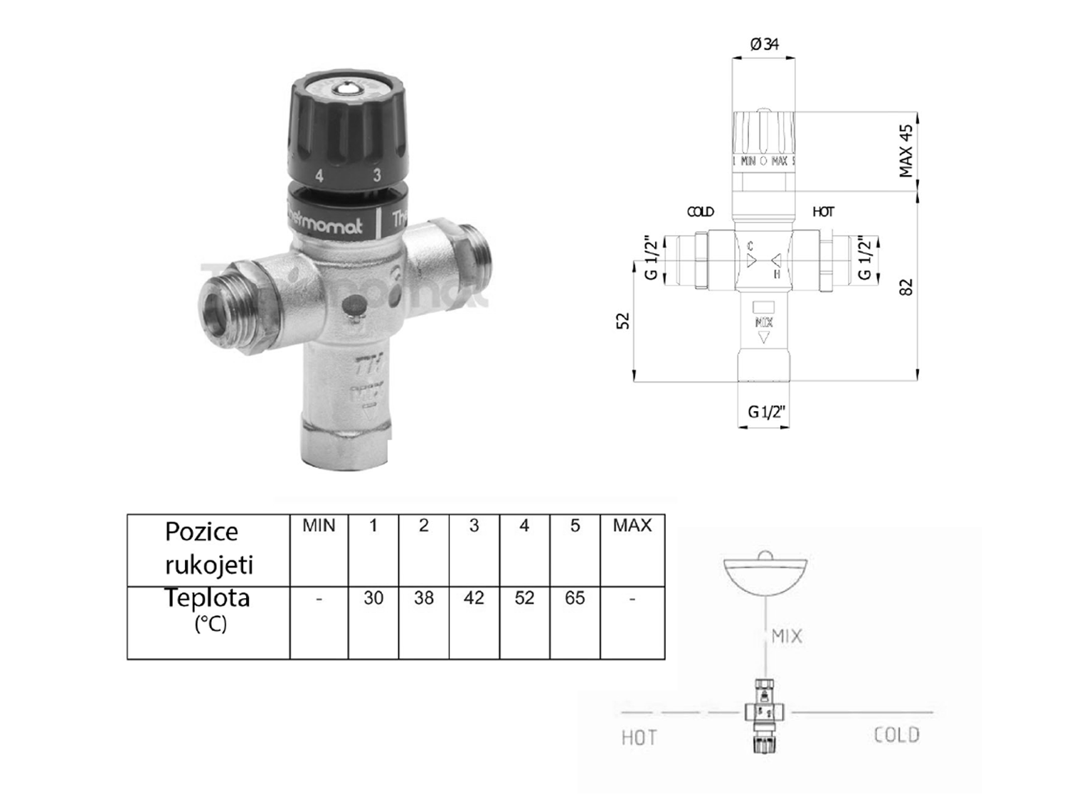 Termosztátos keverőszár visszacsapó szeleppel, 1/2", 30-65C (TMT12MPM)