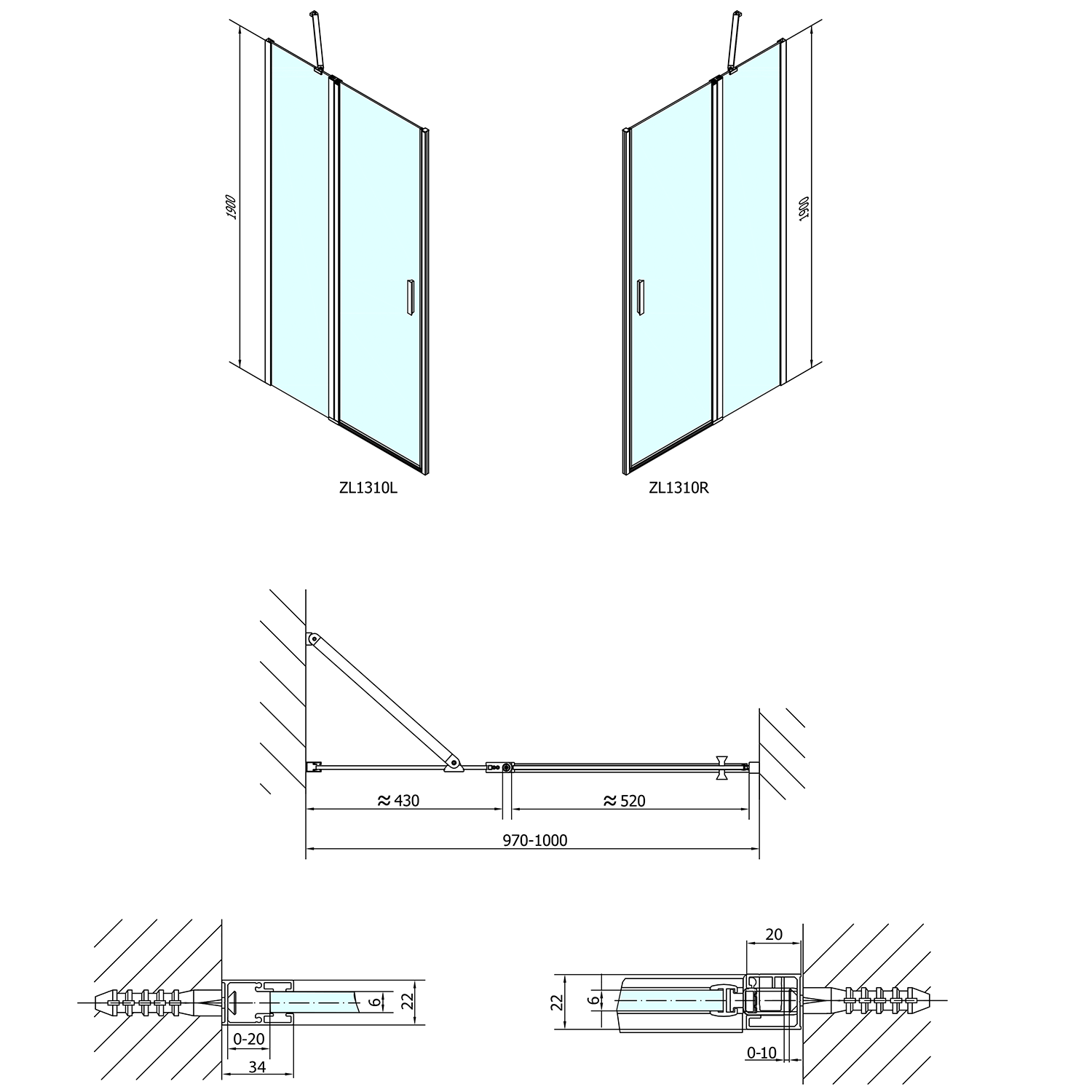 ZL1310ZL3210 POLYSAN ZOOM LINE zuhanyajtó és oldalfal, jobbos/balos, 1000x1000mm, transzparent, króm