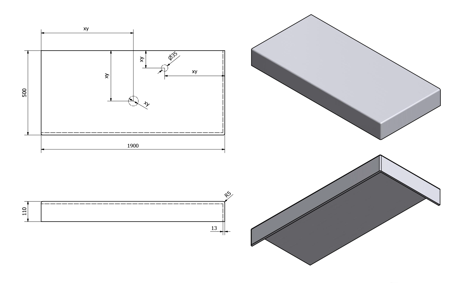 • Can be supplied with tap and waste holes according to drawing (can also be drilled at the installation site)
