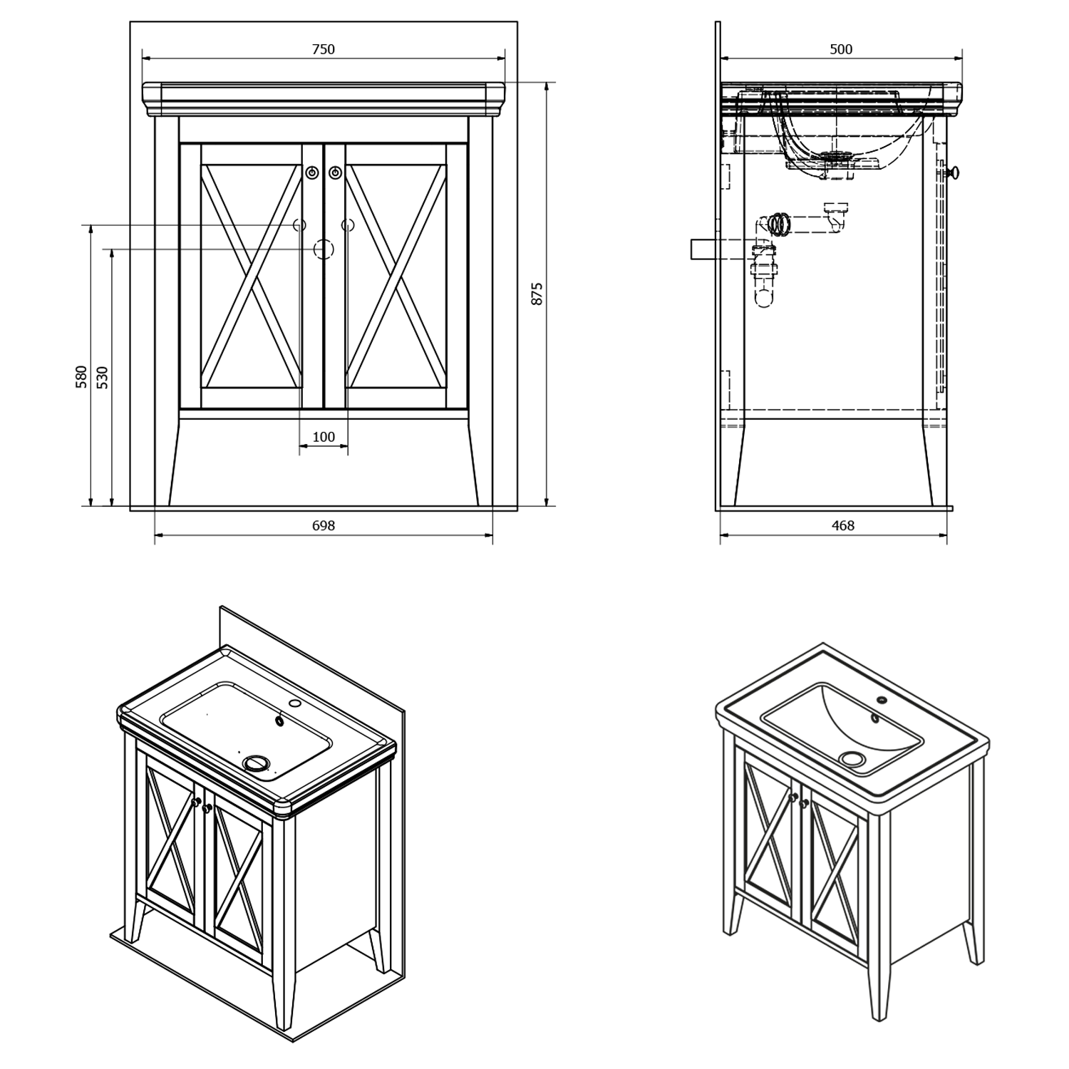 CR275 CROSS Mosdótartó szekrény, 2 üvegajtóval, 70x81x47cm, antik fehér