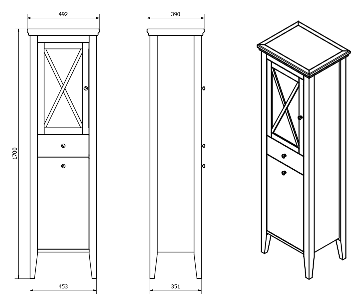 CR217 CROSS állószekrény, 1 üvegajtóval, 1 fiókkal, jobbos, 47x120x39cm, antik fehér
