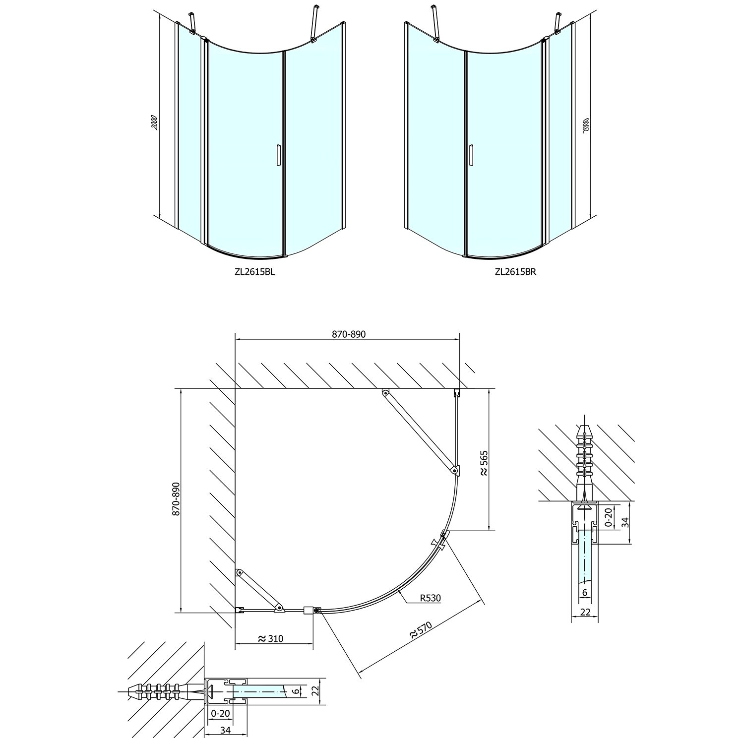 ZL2615BR POLYSAN ZOOM LINE BLACK íves zuhanykabin, jobbos, 900x900mm, transzparent, matt fekete profil