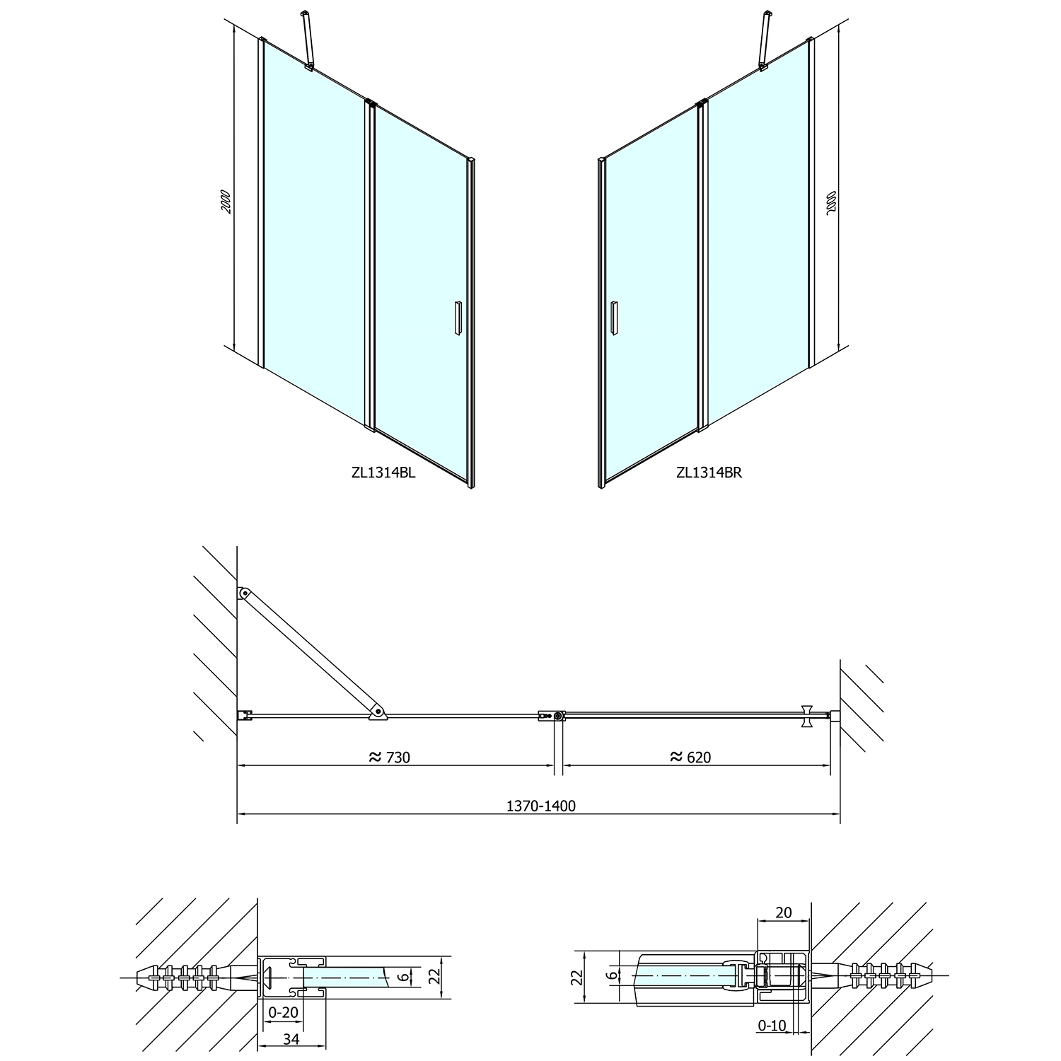 ZL1314BZL3210B POLYSAN ZOOM LINE zuhanyajtó és oldalfal, jobbos/balos, 1400x1000mm, transzparent, fekete