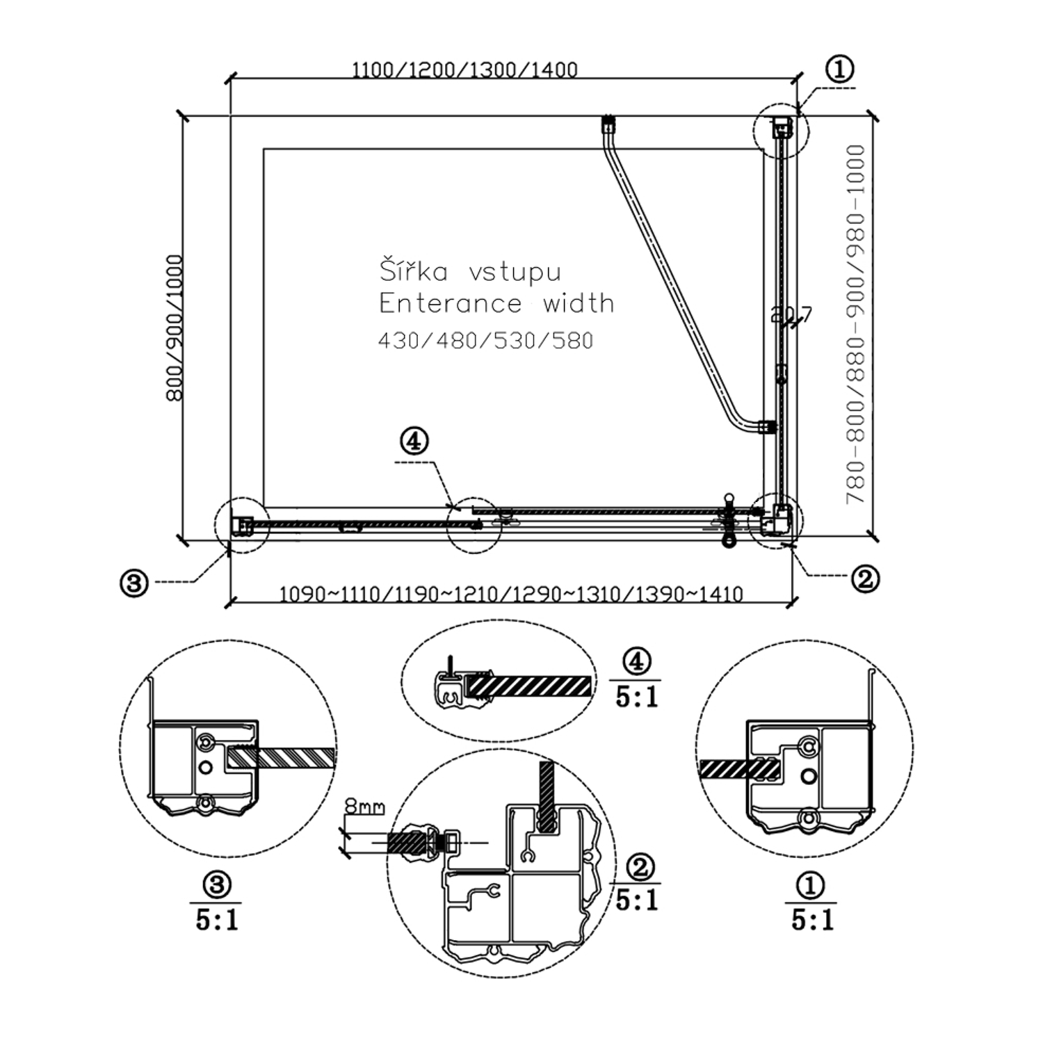GQ4211CGQ5680C ANTIQUE szögletes zuhanykabin 1100x800mm, balos/jobbos