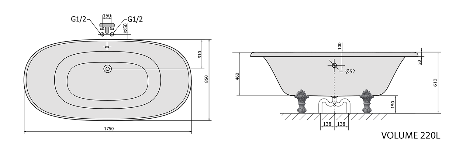 POLYSAN REGATA szabadonálló kád, 175x85x61cm, matt króm lábak, fekete/fehér (10251)