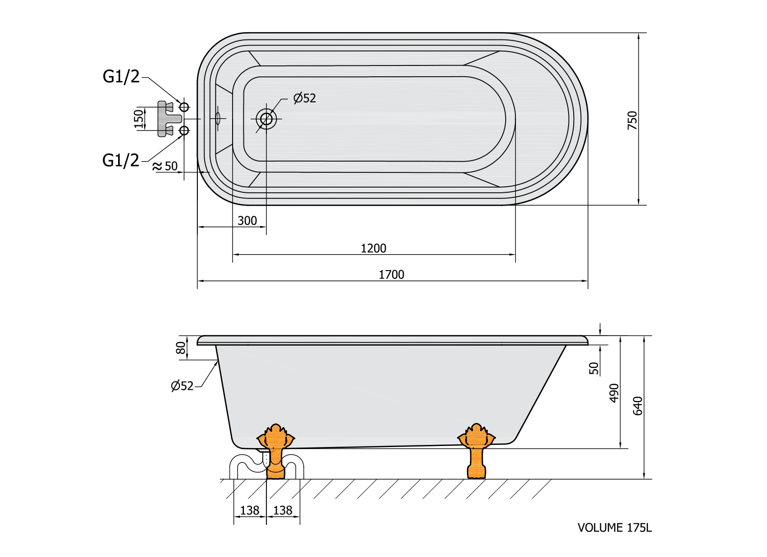 POLYSAN VICTORIA szabadonálló kád, 170x75x64cm, króm lábbal (68122)